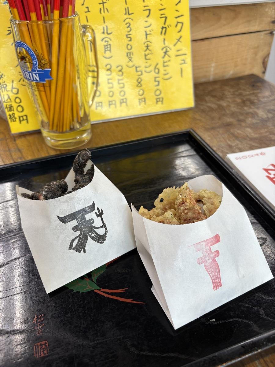 エンドー名物の「ゲソ天」この日のチョイスはイカスミ香る「ブラック味」と人気の「塩レモン味」